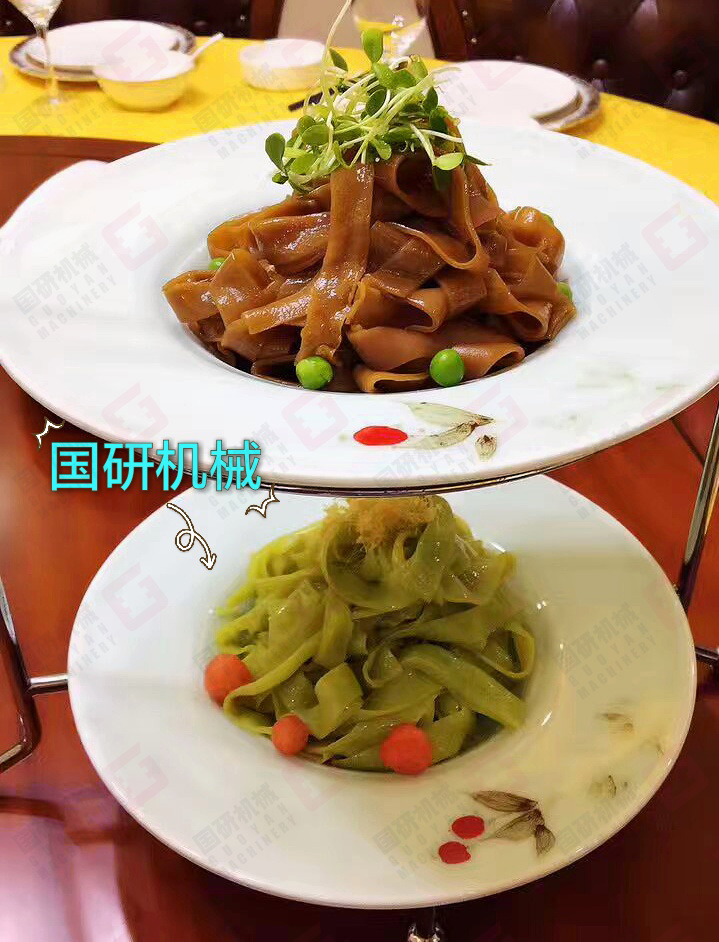 5、該機(jī)生產(chǎn)的拉皮、粉皮厚薄可任意調(diào)節(jié),保全了原料的全部營養(yǎng)成份,味道鮮美,清亮剔透。