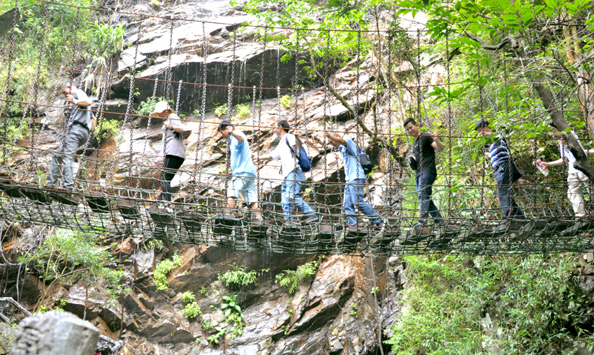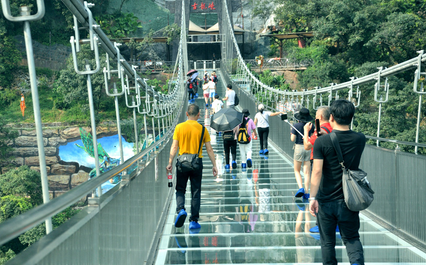 兩小時的小北江之游,大家都還余味未盡。導(dǎo)游又帶上大家趕往這次團(tuán)建活動的重頭戲的目的地:古龍峽的“云天波霸”。今天公司參加團(tuán)建的所有員工都要挑戰(zhàn)目前世界上較寬的高空玻璃橋,玻璃橋像一條通體透明的巨龍連接著峽谷兩岸,橋下懸空超過100米,站在橋上向下看,真是令人心驚膽戰(zhàn),大家相互鼓勵,三三兩兩牽手前行,用相互的關(guān)愛順利通過并成功抵達(dá)世界較大直徑的懸空玻璃平臺。盡管大家都汗流浹背,但每個人臉上都洋溢著喜悅。因為此時大家都收獲了克服恐懼心理后戰(zhàn)勝困難的勇氣和成功!