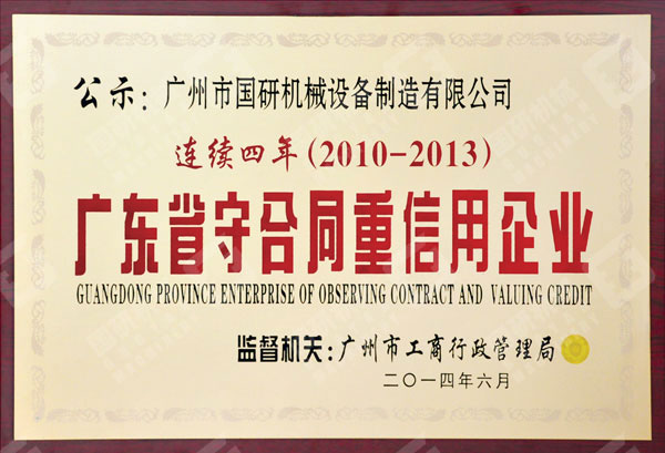 2014年7月,廣州市國(guó)研機(jī)械設(shè)備制造有限公司獲得由廣東省工商行政管理局授予的2013年度“廣州省守合同重信用企業(yè)”榮譽(yù)稱號(hào)。這是公司連續(xù)多年來(lái)多次獲此殊榮。