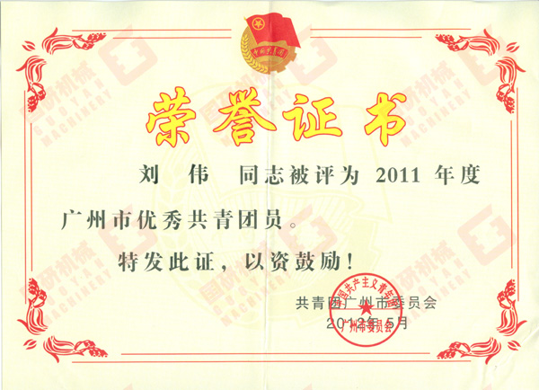 2012年6月,國研機(jī)械公司劉偉同志被共青團(tuán)廣州市委員會(huì)評為“2011年度廣州市優(yōu)秀共青團(tuán)員”。